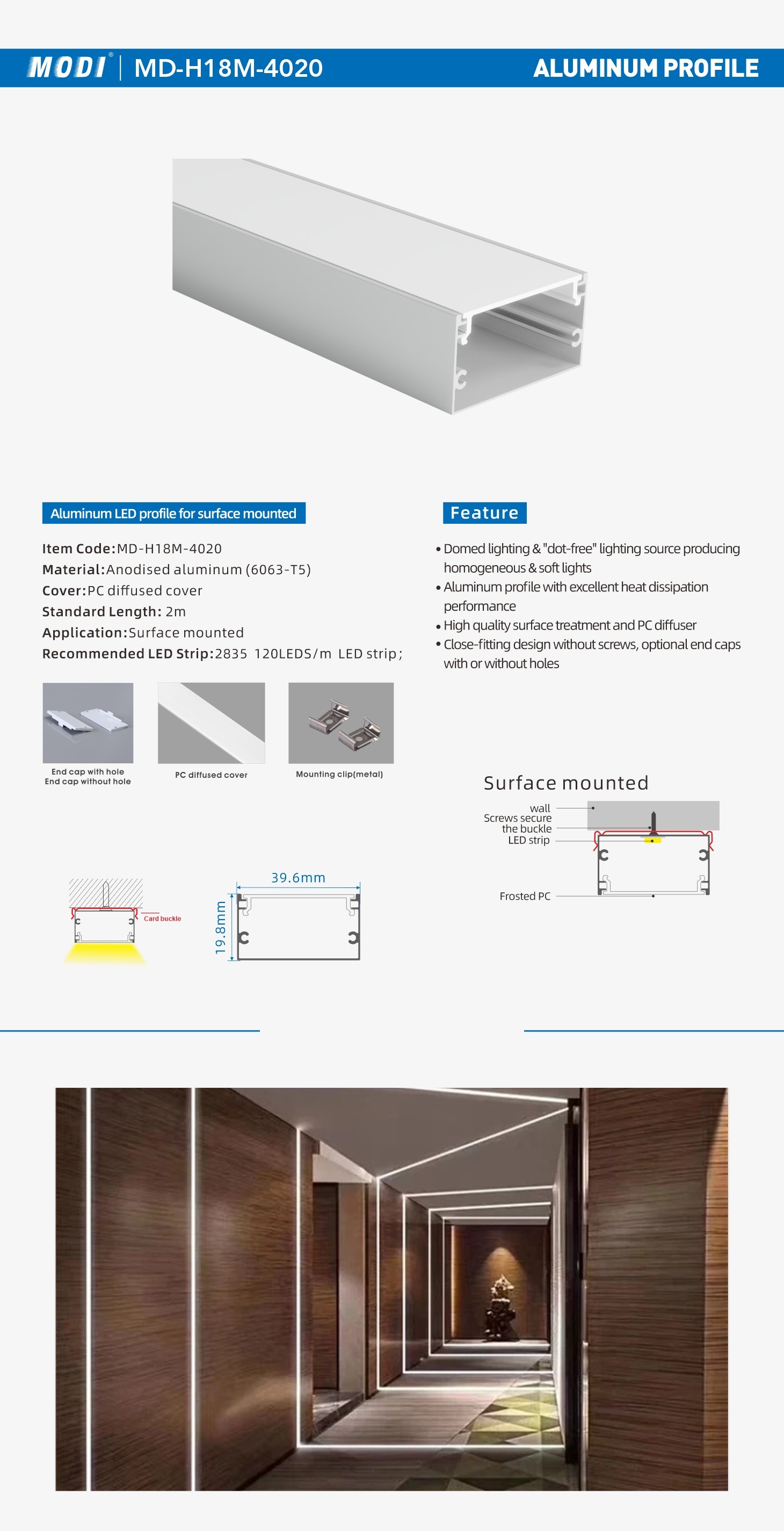 Aluminum LED profile for Surface mounted or recessed
