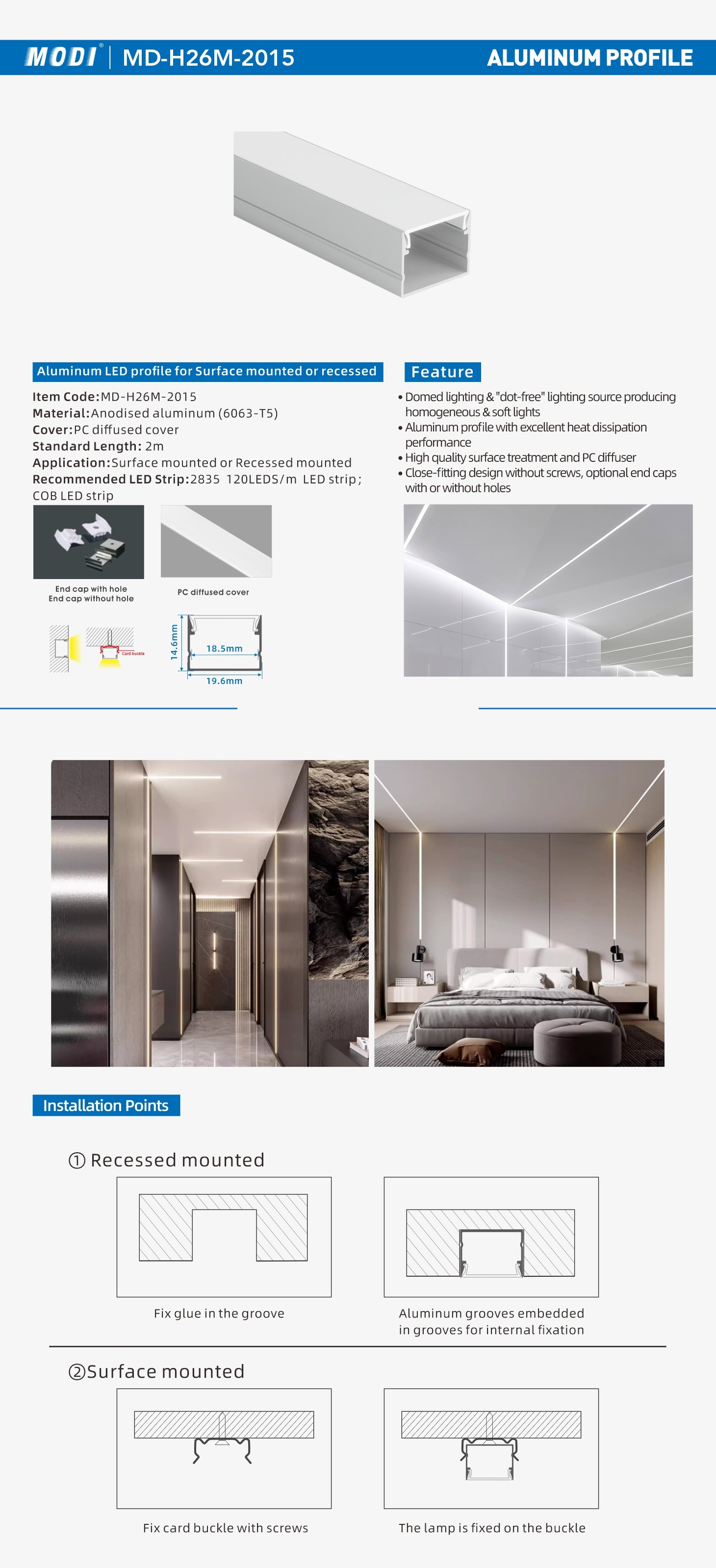 Aluminum LED profile for Surface mounted or recessed