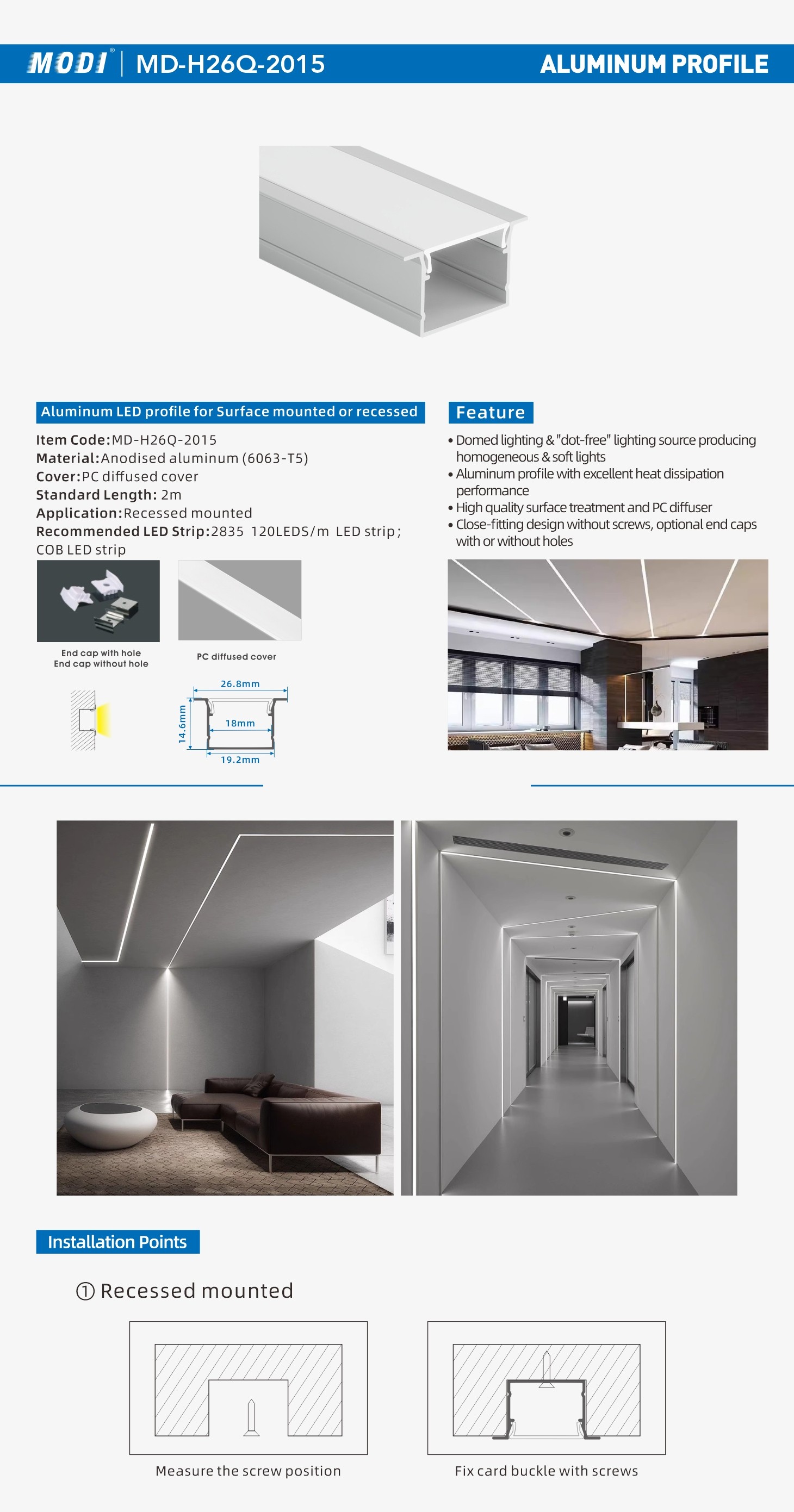 Aluminum LED profile for Recessed mounted