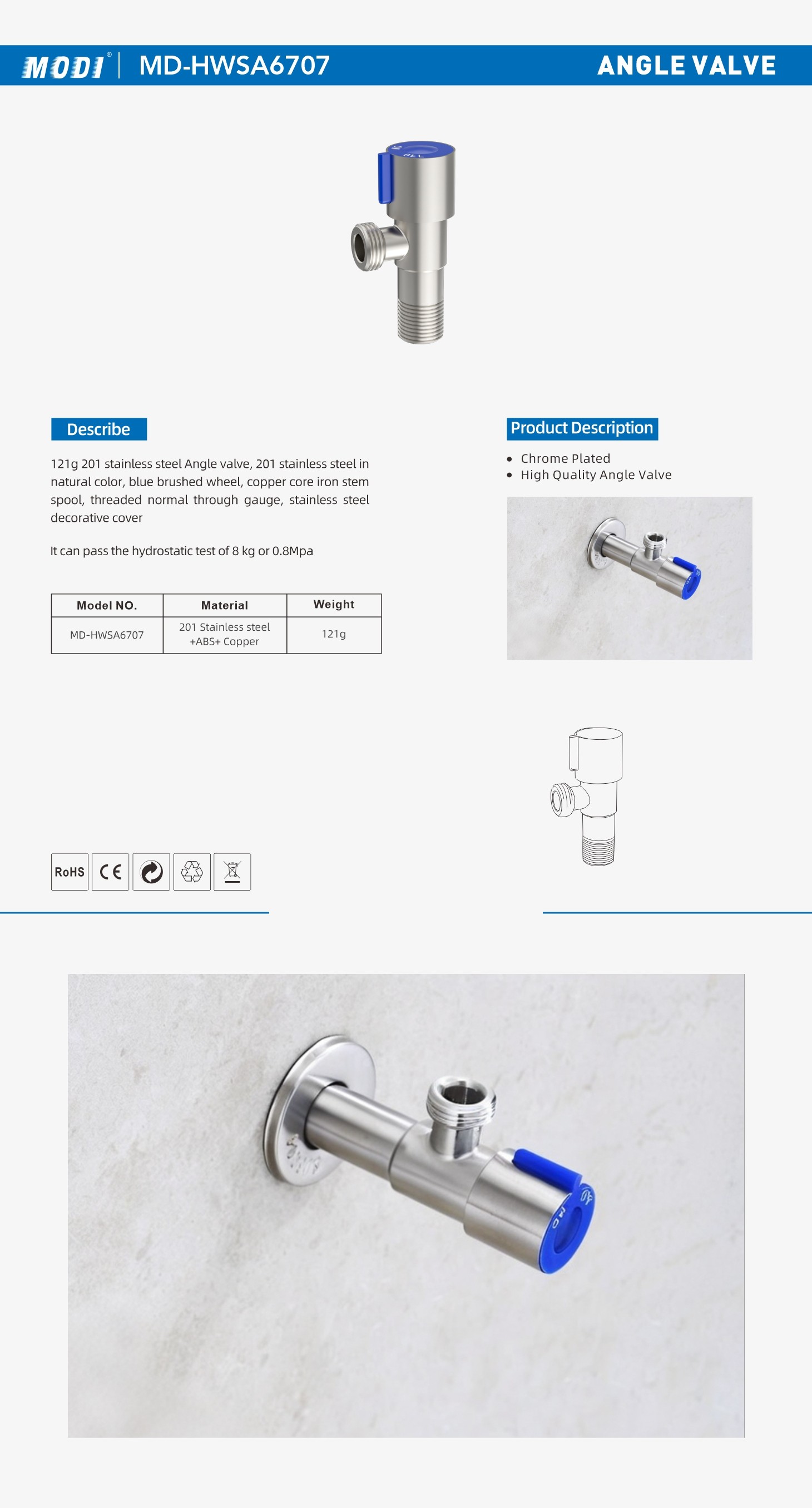 121g Blue Wheel 201 Stainless Steel Natural Color Angle Valve