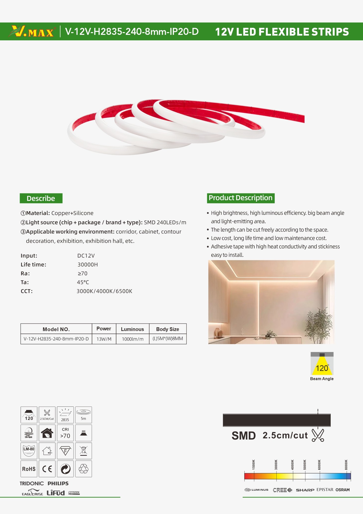 Model NO.: V-12V-H2835-240-8mm-IP20-D